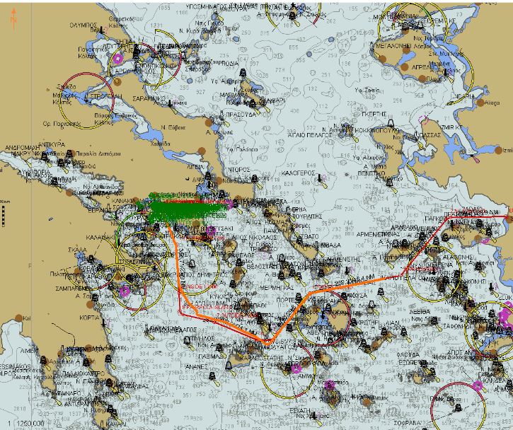 Our route across the Aegean, passing south of islands for shelter, or ‘running’ with the weather’. Certainly not the most direct, but definitely the safest and most comfortable