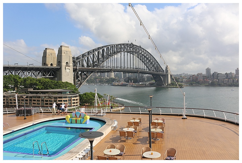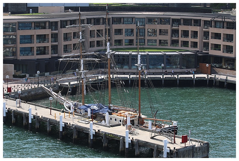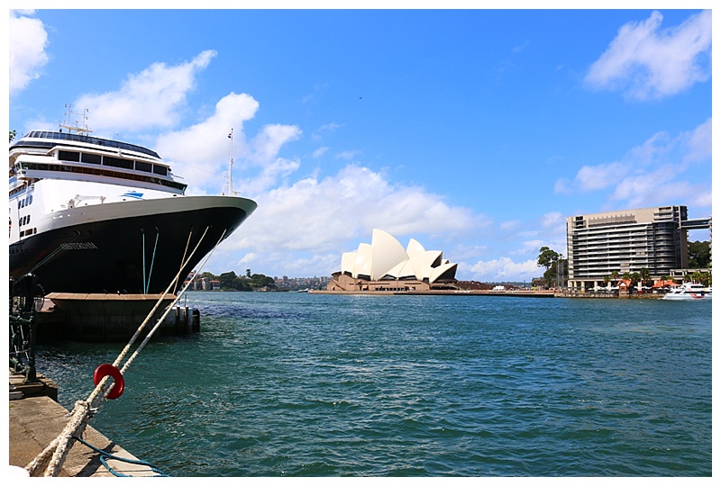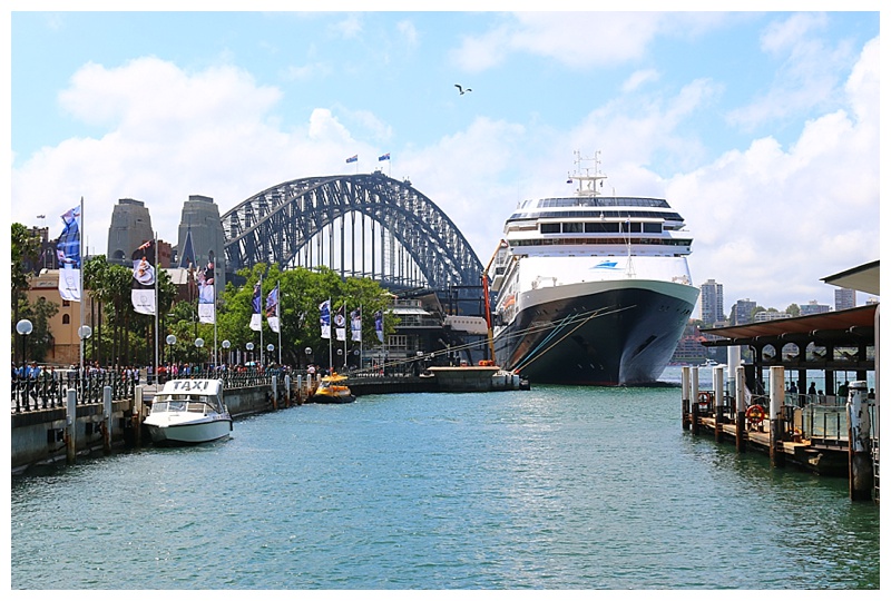 I concentrated instead on the locale of our berth, ‘Circular Quay’ as it is known, a transport centre for Sydney tourists and commuters alike; it consists of a train and ferry station, while a short walk away is the iconic Opera House.  The area is full of tourists, cameras to the fore and many seize the opportunity to pose near the bow of our lovely “Amsterdam” and have the Opera House in the background.  It was sunny and warm, everyone walking around in summer dresses or shorts.