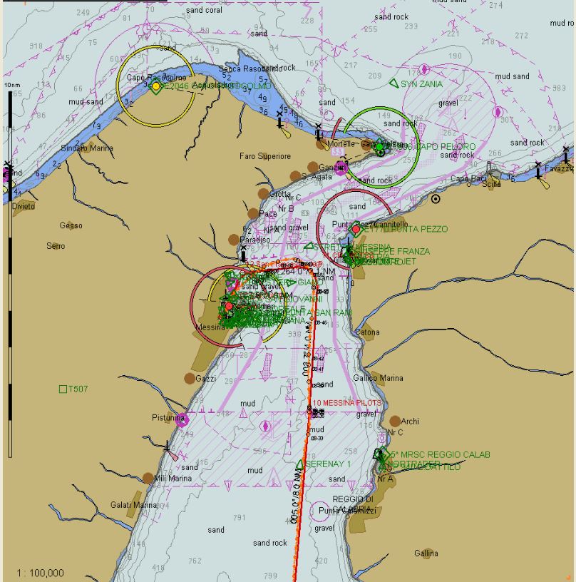 A turn into the Straits and towards our pilot boarding ground. Unusually, the Messina Straits pilots do not require vessels to slow down for boarding. The ‘usual’ speed is anywhere between 5 and 8 knots, here they will embark and disembark a ship at anywhere up to 24 knots! A disembarking photo is posted a little later in this post.