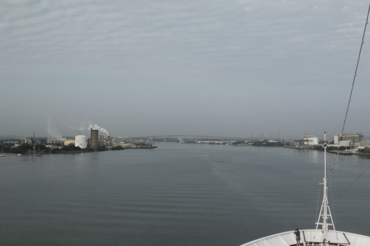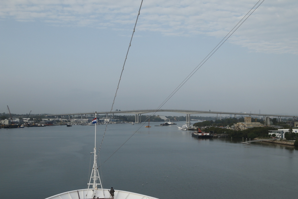 Finally, we have to pass under a bridge; this has a clearance of 57 metres in the centre, we have a height, (or ‘air draft’) of 48 metres, no problemo, providing you get it dead centre, otherwise it will involve a great deal of report writing and explanations as to why we have lost our funnels. 😳