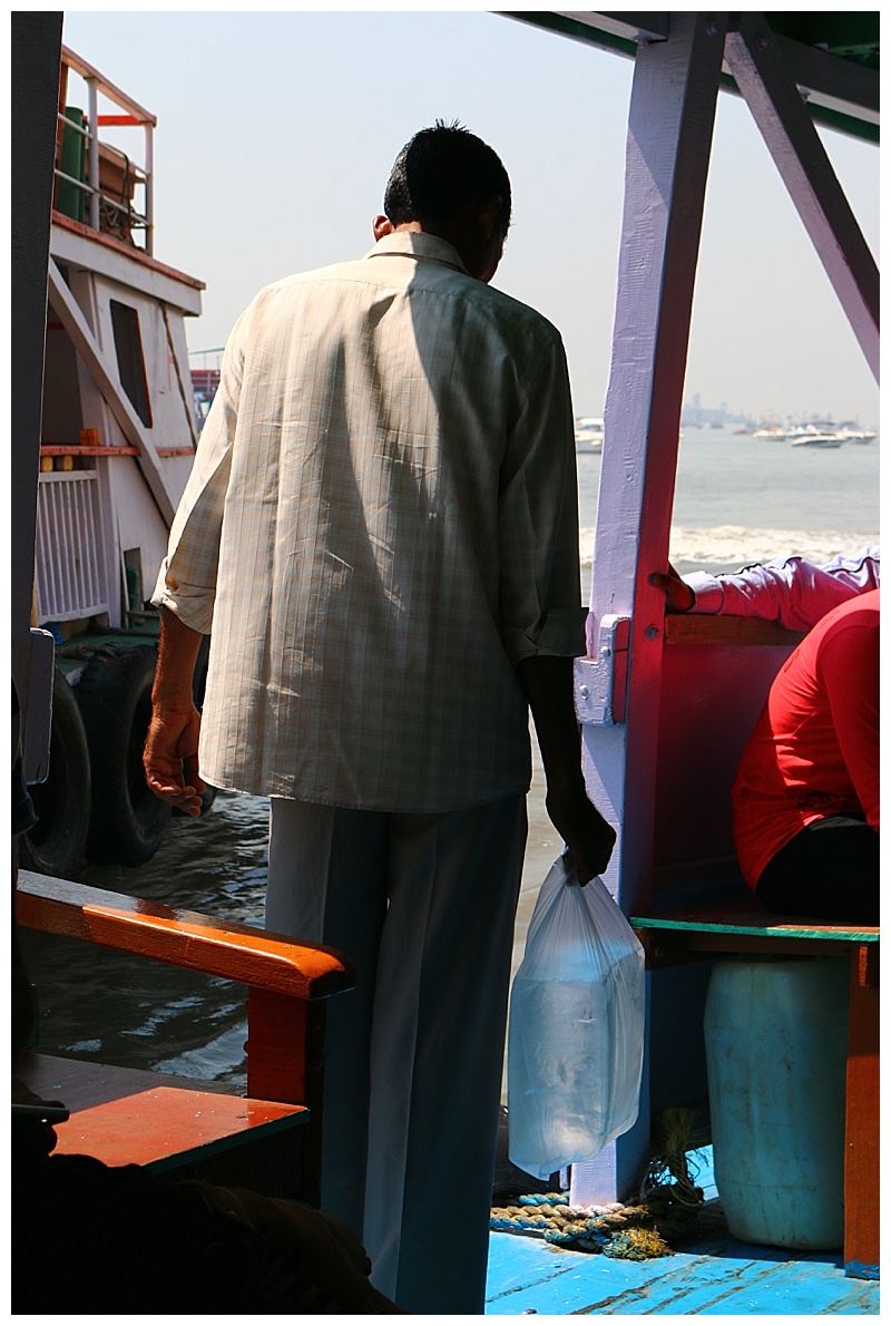 Anyway, onto lighter matters; a walk under massive Banyan trees and into a security check-point before walking onto the square surrounding the ‘gate’. Down to the ticket office and purchase the ferry tickets for Elephanta, 160 rupees for the ‘luxury’ ticket, ($2.70). We never found out what the ‘luxury’ was, (as opposed to the cheaper ‘Economy’ at 100 rupees), because we were all crammed together on the same deck 😕 Some photos as we walked to the ferry and on it.