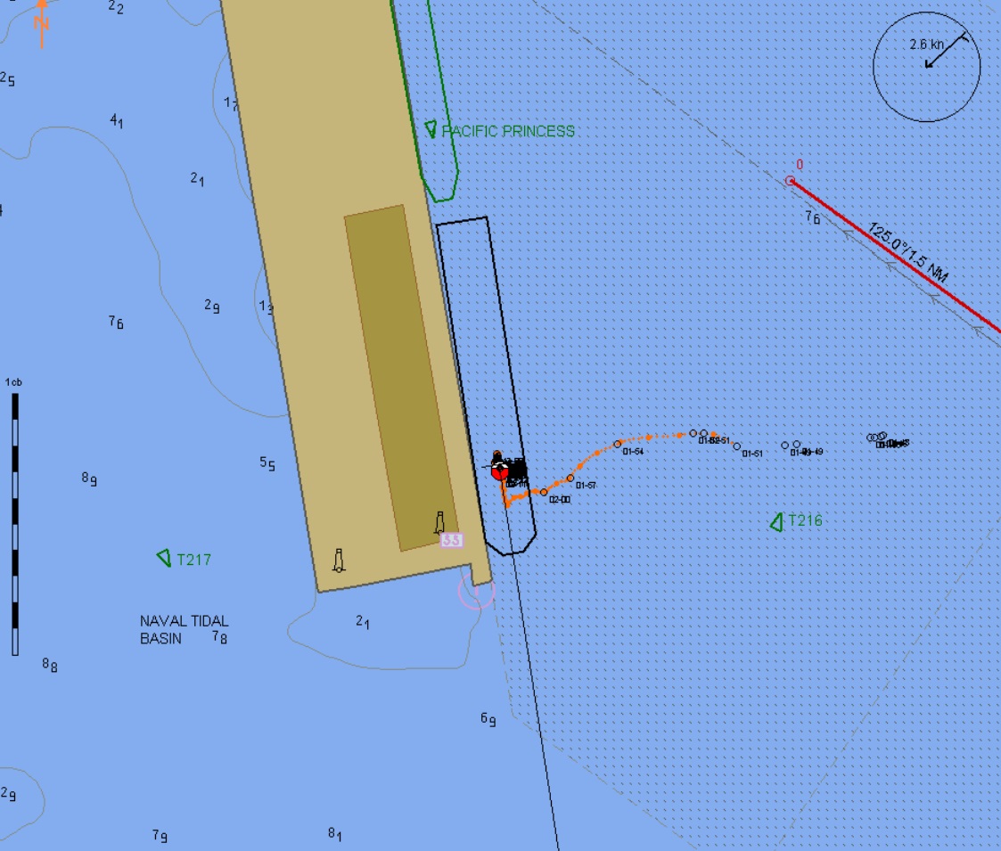And the berth itself. The orange is our final track. With a very strong ‘flood’ tide, I more-or-less left the current slightly on the port bow and used the current to set me towards the berth.