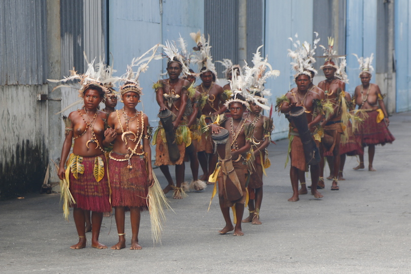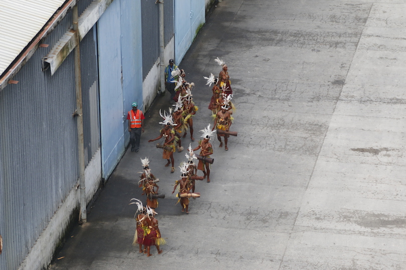 That having been said, our intrepid band of ‘travellers’ were off the gangway to explore at the first opportunity, some by boat, most by foot.  Not before they filmed or photographed a local group of dancers, resplendent in clothing that, according to our pilot, was meant to imitate the bird of paradise.  Much banging of drums and chanting accompanied their rhythmic oscillations.  Yes, as you will see from the photo, the ladies were topless and apparently this is regarded as quite normal here in PNG.  (They were the only ones I saw during my photo-walk though).