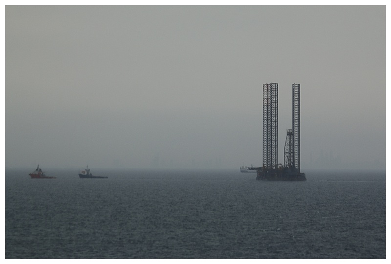 Passing a jack-up rig, under tow.