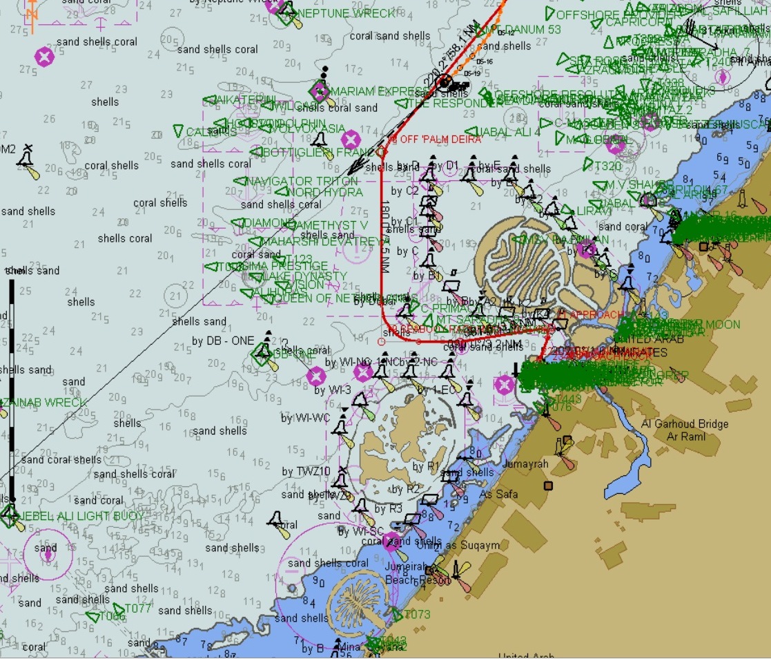 Overview. The green triangles are the transponders of ships