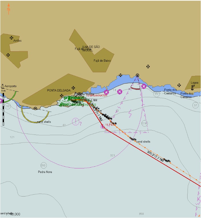 Our track is the ‘dotted’ orange. We were in fact heading west, the wind set us along the north-west resultant track.