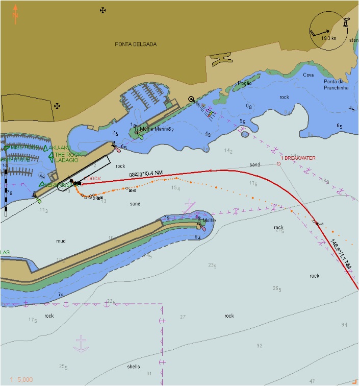 I had been expecting it of course, the forecast had been promising a westerly gale and, unfortunately, it had been far too accurate. Delgado lies on the south side of the island, the harbour lies in a shallow bay, more of a small indentation in the coastline than a bay and, similar to many of these Azores ports, was protected to some extent by a breakwater. Unfortunately, with the wind direction as it was, there was little shelter from buildings, it was coming straight into the harbour. Outside, on the breakwater, the large swell was breaking, sending towering spray over the top and dissipating in the wind.