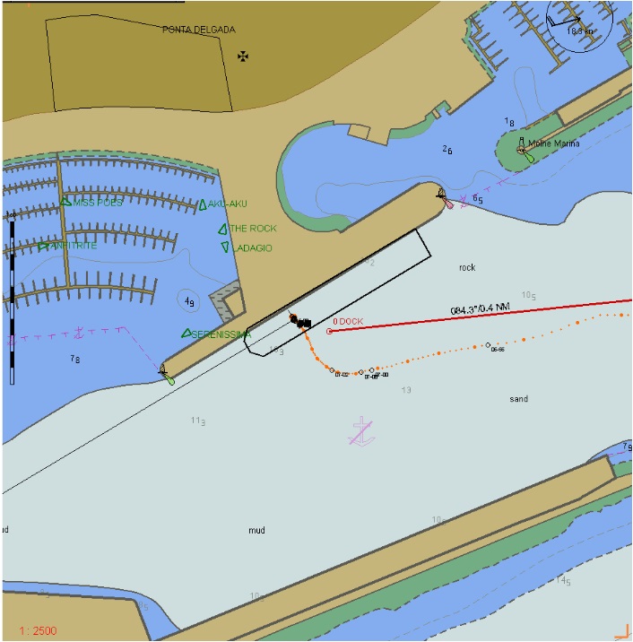 We wallowed in the swell, even though I kept a stabiliser out and the Quartermaster was having a hard time steering; then, mercifully, we were in and now I had to stop her, we had needed the speed to steer her in, now the dock was a ship’s length ahead. Switching to joystick, (she stops faster using it), I slowed her down, still keeping head to wind as much as I could and slowly worked her over towards the dock, adjusting the heading until parallel and then pushing her on, as the wind was now on our starboard side. All fast, the swell manages to penetrate the harbour and we found ourselves ‘ranging’ up and down under its effect. We put out ropes in a veritable knitting pattern 😯 , we had 48 hours here and the weather would not abate.