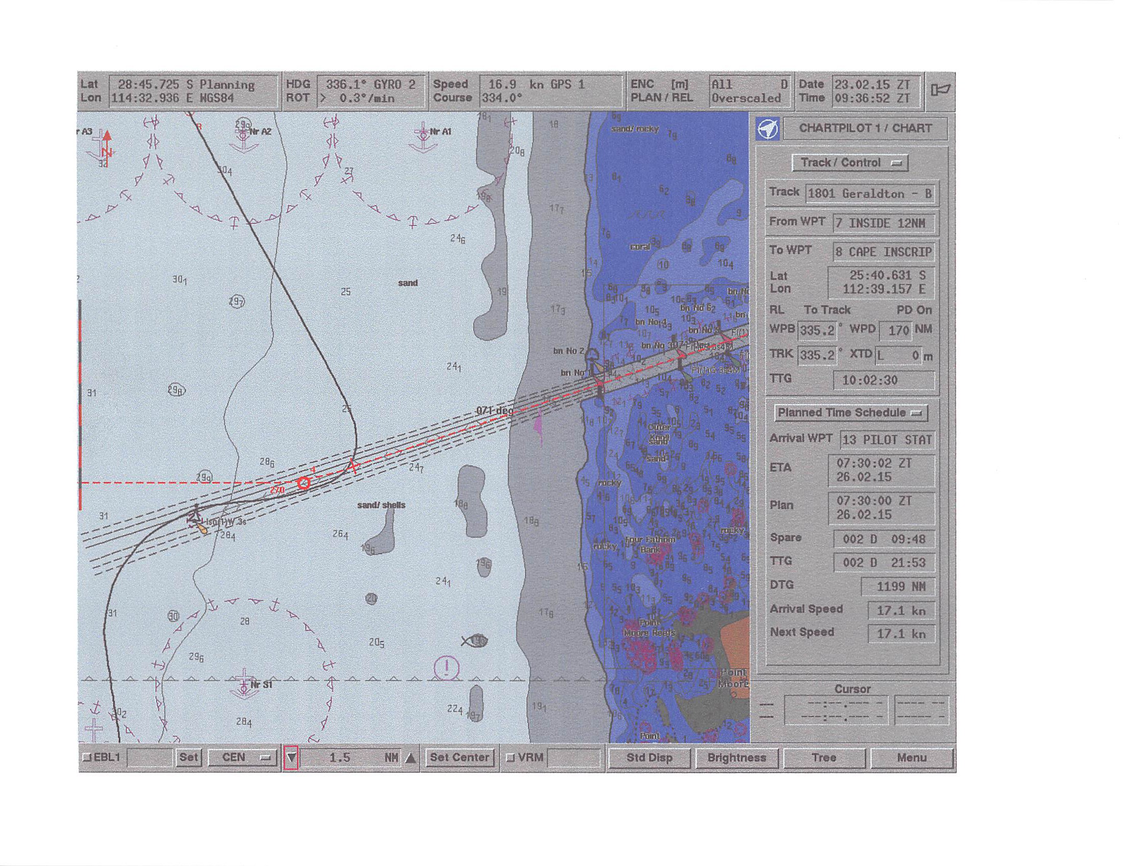 Overview of Geraldton. The approach and ship channel, the port, lower right and anchorage north of it, the far right circle, or waypoint.