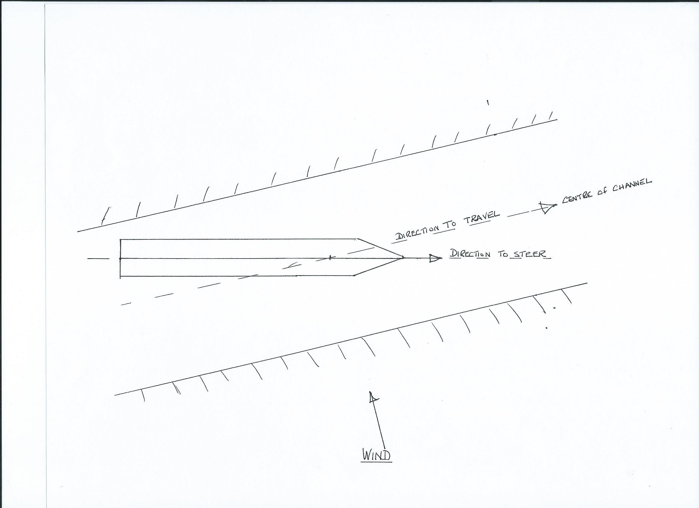 The wind, right on our starboard beam, was gusting 30 knots at times and we were steering 12° off the course of the channel. With this ‘leeway’, one has to take into account ‘swept path’, the increase of the ship’s path as it ‘crabs’ sideways. Forgive the crude drawing, however it may explain, a picture is worth a thousand words 😯