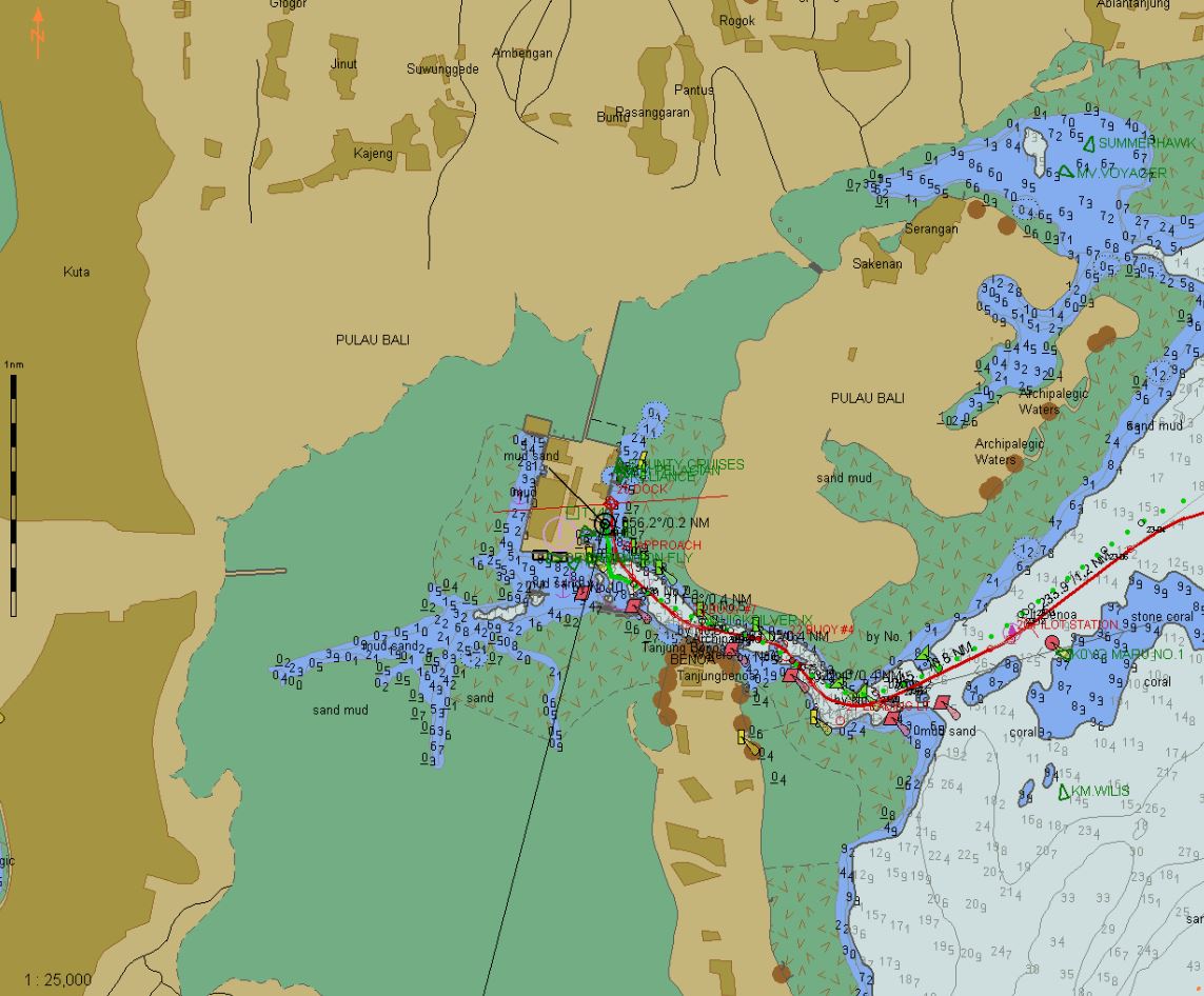 Benoa approach has to be treated with the utmost prudence; a narrow, winding channel with no room for error. The channel itself has a dredged depth of 8 meters or 26 feet, although some areas are deeper. We happen to have the same draft, so tidal rise is essential. On our arrival, the tide was rising and we had an additional 1 meter of water to ‘play’ with. Some of the channel marks were out of position too, just to add to the fun.