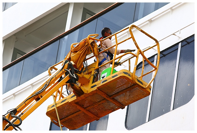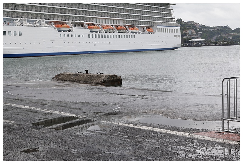 Having boarded our (very competent) pilot and discussed our approach and docking, we made a run for the entrance. The wind was pushing us sideways, the swell was making us roll, (our stabilisers were in at this stage) and to add to the mix, the entrance is narrow and, because of the swell, had a current across it. All-in-all quite a concoction 😕