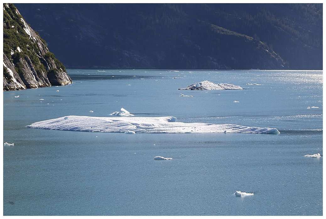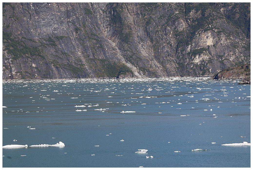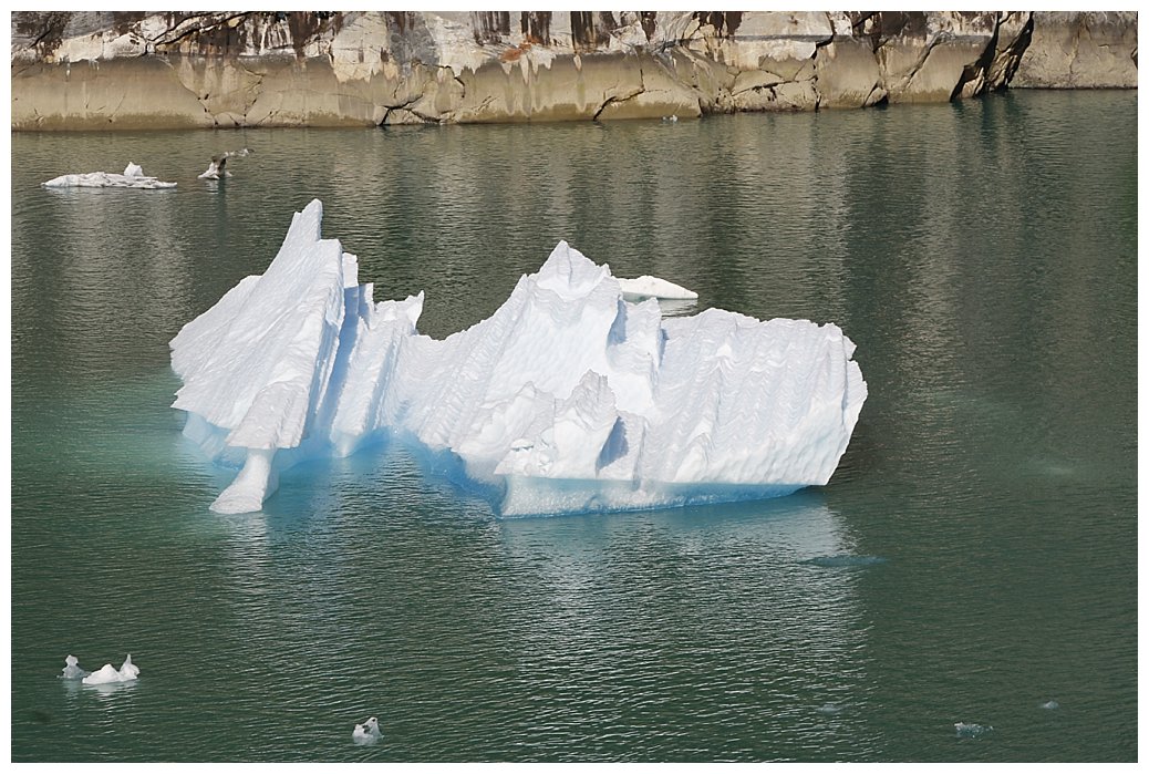 Then we’re through and ‘ice dodging’ for the next 30 miles. We are told that the area near Sawyer glacier, our destination, is choked with ice and impenetrable, however the route is through magnificent scenery and hey, the sun is shining too.