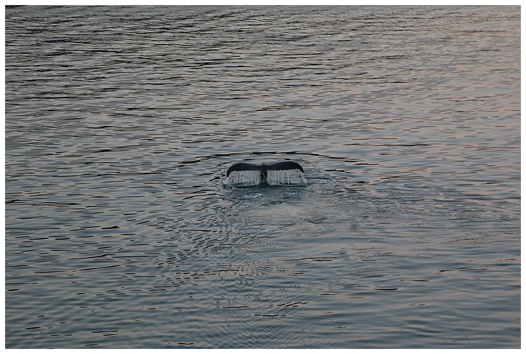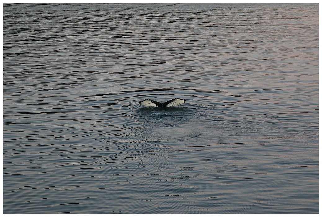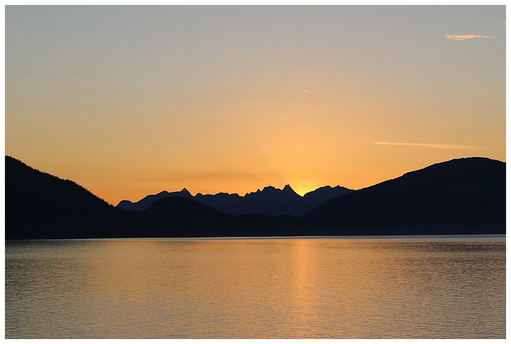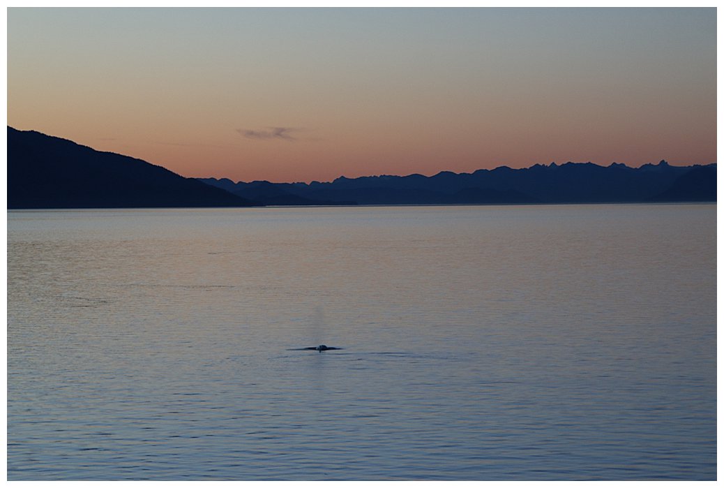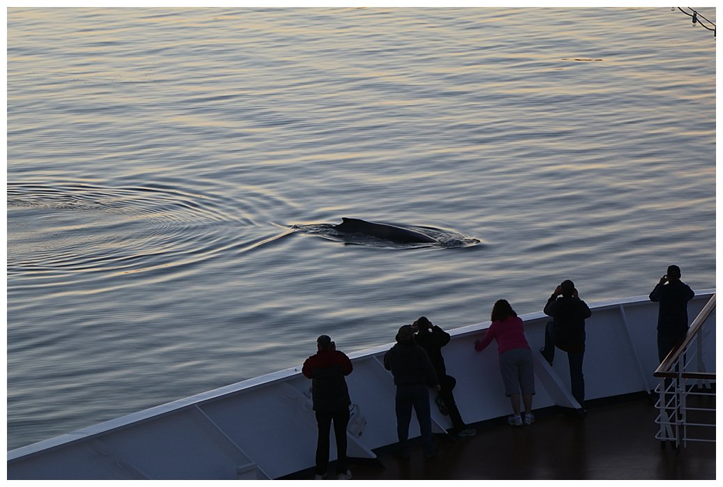 Crossing the Bar once more we only need 8 knots to make our ETA in Juneau the next day. Frederick Sound is calm, the sun is shining, what to do? On every cruise, we try to create ‘Magic moments’ and here was my opportunity. In the distance, to the south, we could see the tell-tale sight of whales blowing, high misty plumes catching the sun. We slowly moved south and, wondering where our humpbacks had gone, we stopped our propellers and drifted in the calm seas. Over to port, a small Alaska-based cruise ship had done the same and we suddenly notice the spout of a whale near her. Then it was our turn, with a glorious orange sky from the setting sun, the whales frolicked around us as we drifted; stateroom balconies were packed and the occasional scream of delight could be heard through the still air, so still in fact that one could hear the whales exhaling quite clearly. We stayed for over an hour and then slowly turned to head north for Juneau.