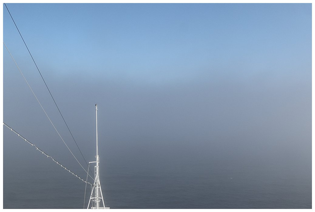 Whistle sounding, we navigated our way north, officers intent on the radar. Occasionally there is break in the fog, fleeting glimpses of the seas before it rolls in again. We call the skipper of the pilot boat and inquire as to the visibility at his station, “I can see 10 miles” is his reply; good, we can manage this and still have a nice day. Sure enough, the fog begins to break, although it still hangs in the near-coast area, where the wind is calm.