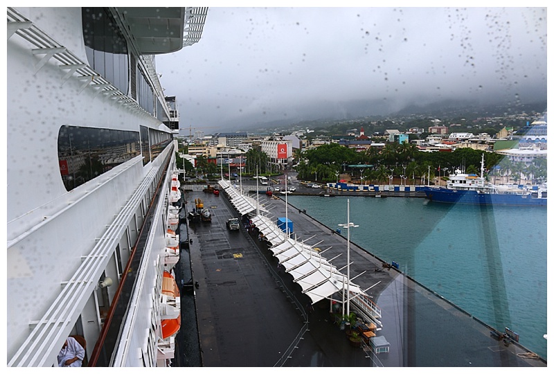 We leave here at 5 p.m. (we are 2 hours behind the west coast; 5 from the east; 10 from U.K. and 11 from Holland). Having taken fresh stores; ‘visited the fuel station’, (500 metric tons of Heavy Fuel oil, or approximately 140,000 gallons) 😉 we have a 150-mile voyage towards Bora Bora, an island surrounded by a reef and certainly one of the most beautiful places on earth. I post one of my ‘library’ photos as, (as much as I hope I’m mistaken), the sun might not be shining tomorrow.