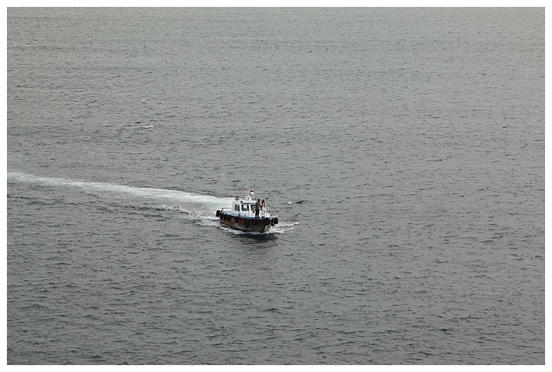 The pilot boat came out to meet us and, although it looks fast, the crew called for a speed of 4 knots for boarding; (maybe their own fuel conservation plan? 😉 )