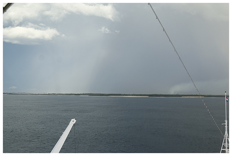 A few miles further north and the coastline becomes clearer. The crane jib, used for lifting our longer gangway, is raised, ready for docking.