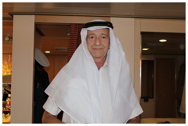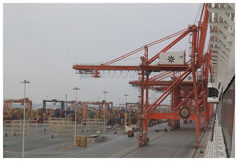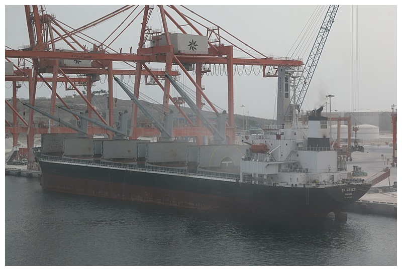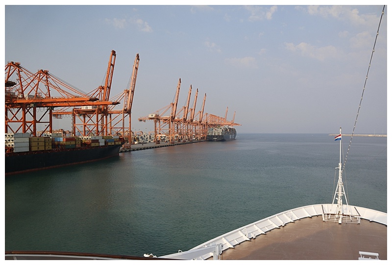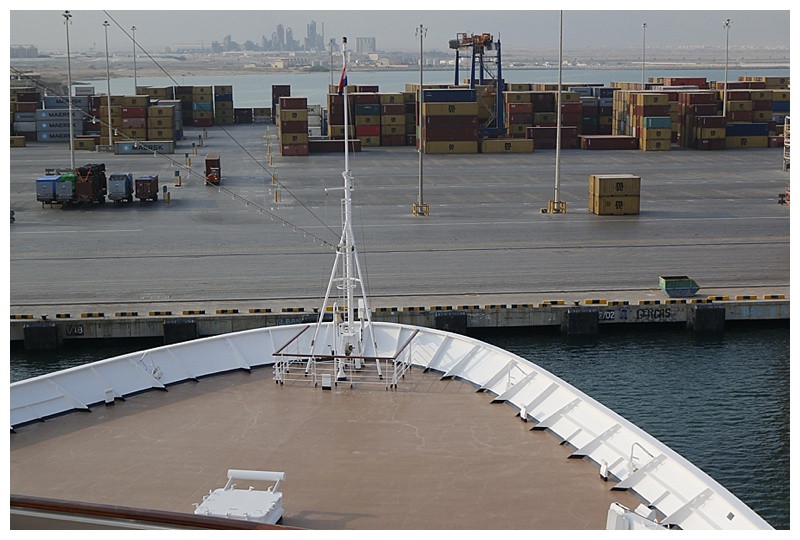 Back to Salalah, our call yesterday. The port is modern and is used mainly as a trans-shipment hub. Container ships bring in their ‘boxes’ and offload them; they are then trans-shipped to ports around the world. Cargo ships are here too, one of them, unfortunately, discharging limestone rock; with the wind direction, we find ourselves coated in a fine dust by the end of the call. All the hard work with sailors wash-downs have come to naught in a few hours.
