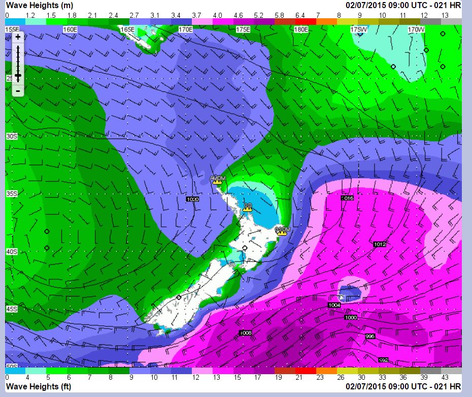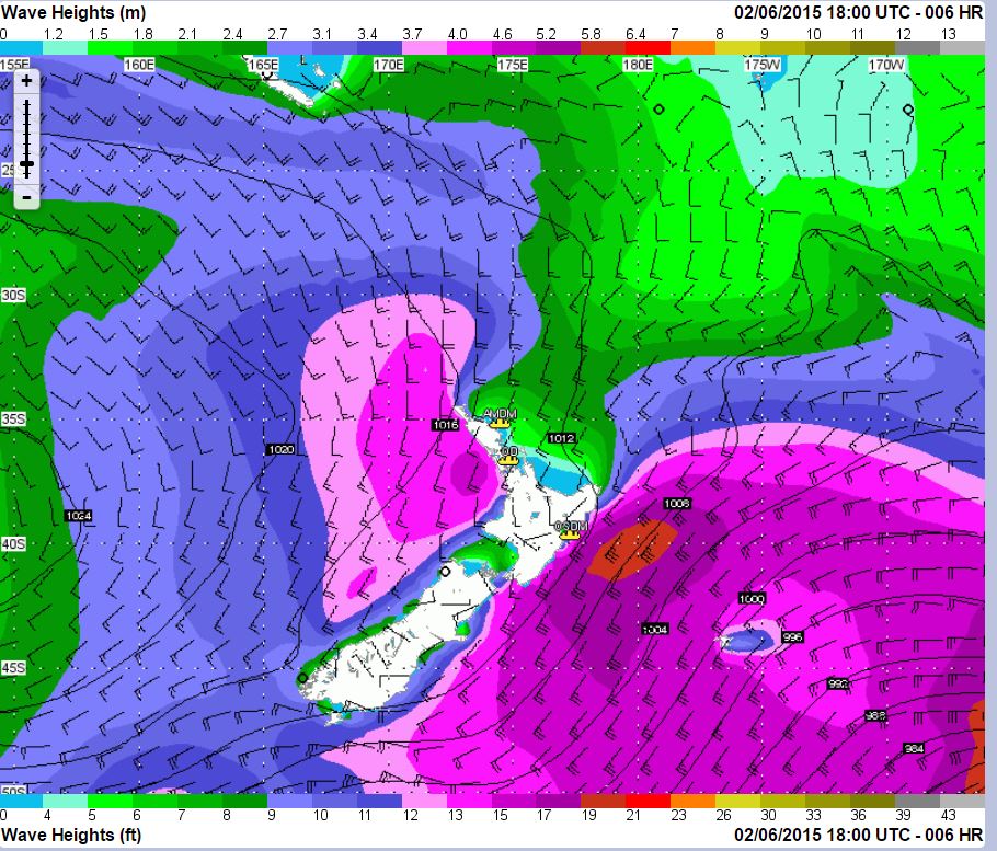 Later, as the storm moves through. having departed Waitangi, we are off the North Cape and about to encounter 10-12 feet seas; nothing compared with the magenta and orange areas, 19-25 feet seas to the south-east.