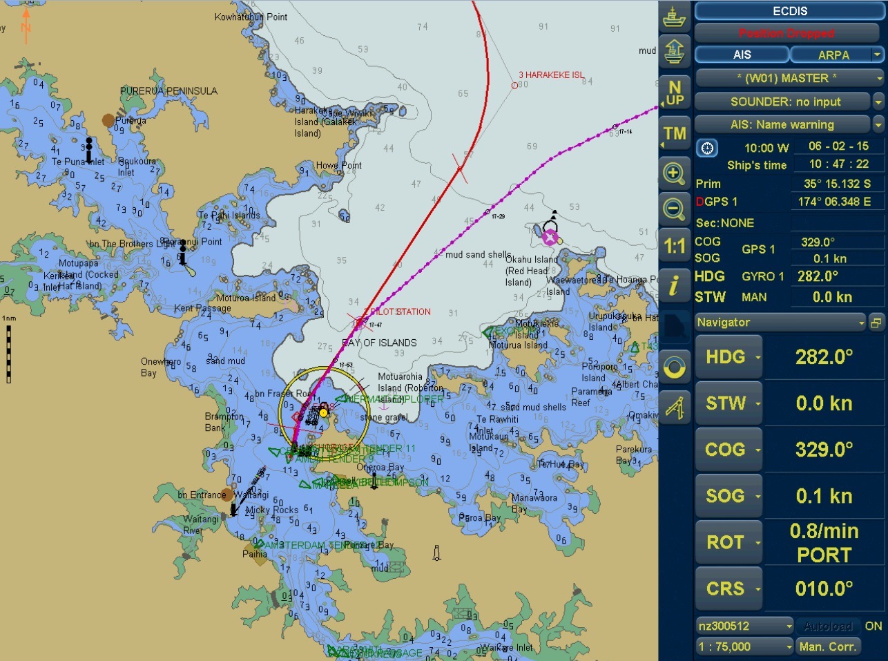 Waitangi, at anchor. The transponders, (AIS, or Automatic Identification Signal) of other vessels, (Ferries, Solstice, our tenders), can be seen in ‘green’