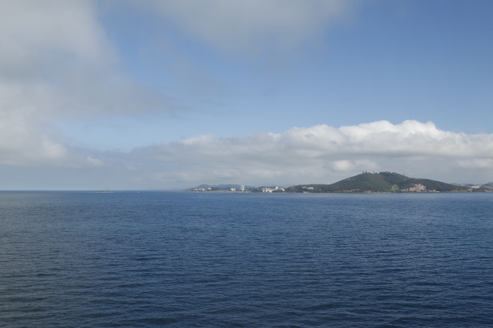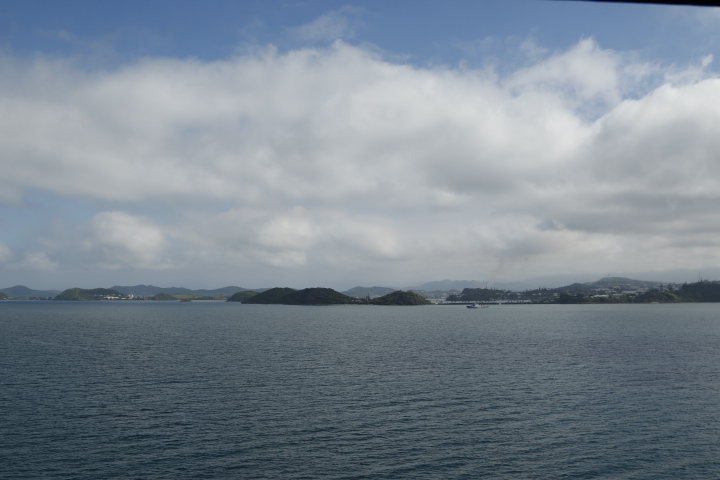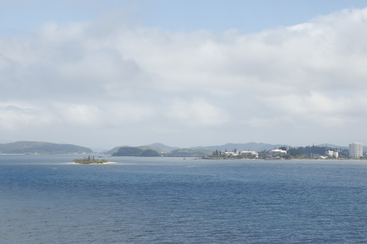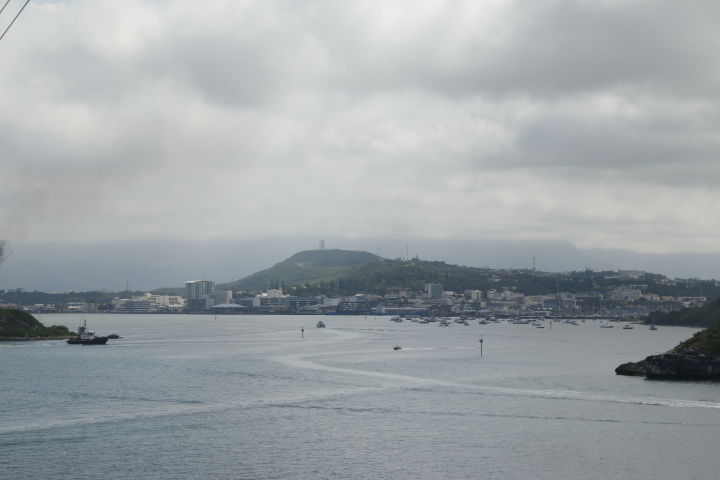 At 6:15 in the morning, on the approach to the eastern end of the channel, it was a murky morning; low cloud and drizzle hung over the coast as we moved west, however the sun came out as we approached the entrance to Noumea harbour, as you can see from the photos.  Later in the day though, it became dull and dreary once more, but the cloud kept the temperature down.