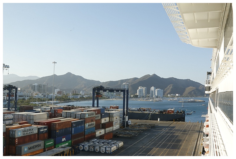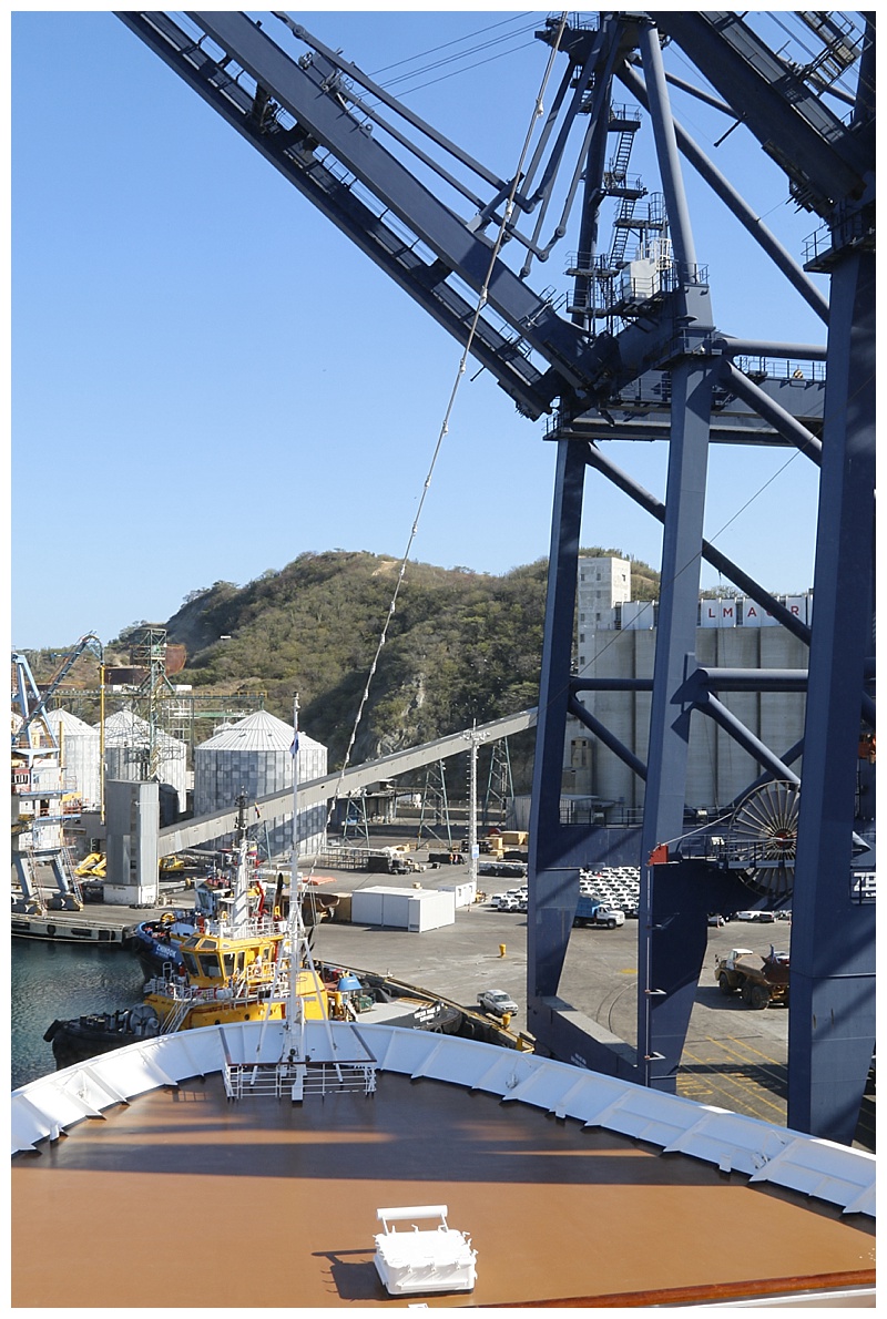 We arrived off the port at 5:45 a.m. with the intention of embarking our compulsory pilot at 6 a.m. As is the case, (unfortunately, on a Grand Voyage), calling at ports which generally deal with cargo ships, seldom seeing a Cruise ship, our berth was occupied. The interloper, a container-ship, was trying to finish cargo as fast as she could; nevertheless we spent 30 minutes ‘hovering’ on joystick in the harbour while we waited. I kept her ‘head to wind’; with the wind conditions, it is easier to maintain position by taking any side-wind out of the equation.