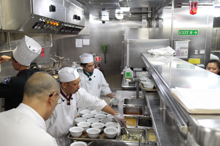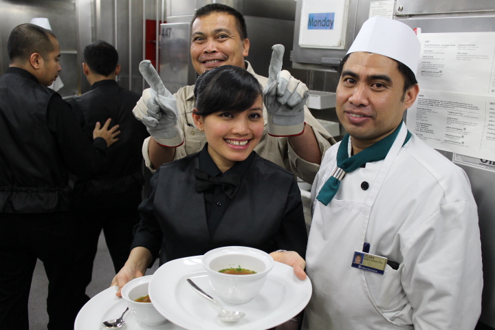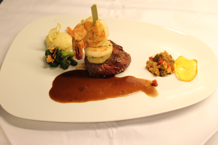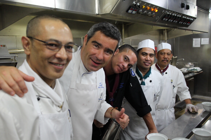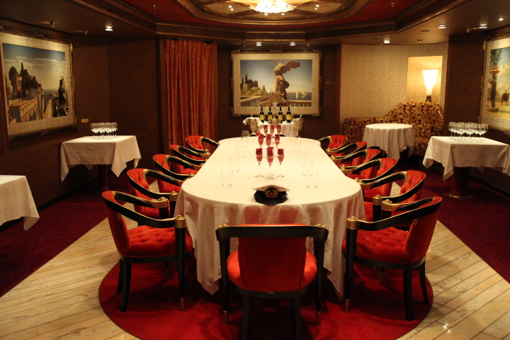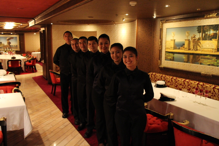 Guests first meet for a pre-dinner cocktail in our Culinary Arts Center, (sic); here they are treated to hors d’oeuvre and meet officers before they are escorted to our Pinnacle Grill restaurant. Each table has an officer, (or two) and their seating arrangements are marked with their uniform cap, (hence my ‘featured’ photo). I have Hans, our Chief Engineer at the other end of my table. When Karen is with me, (she joins in Hong Kong), she would share the table.