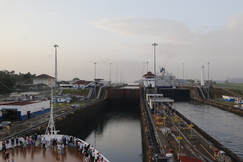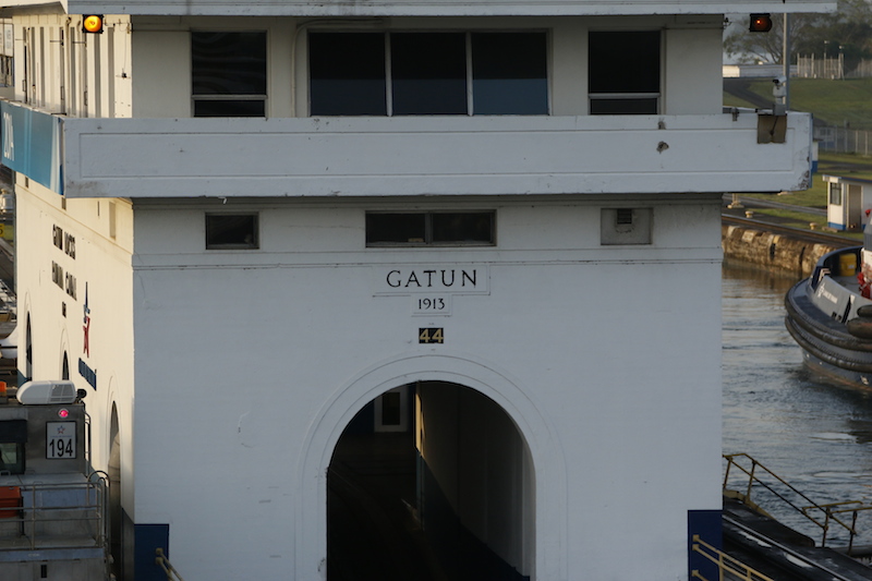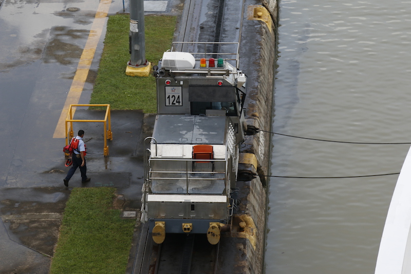 As we approach Gatun, the modus operandi is the same as all the locks we will transit; as near as possible, without touching, (that’s a matter of pride), to the long centre wall, on this the locos wait. Lines are thrown, locos hooked on as the ship moves along and eventually, after the bow is well into the chamber, 3 each side are fast and the locos, advised by the pilot, take us in.