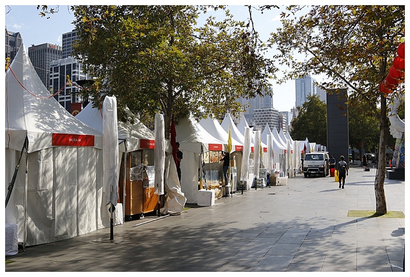 Stalls on the river bank, closed until 10 a.m., they are for Chinese New Year and sell Oriental goods.