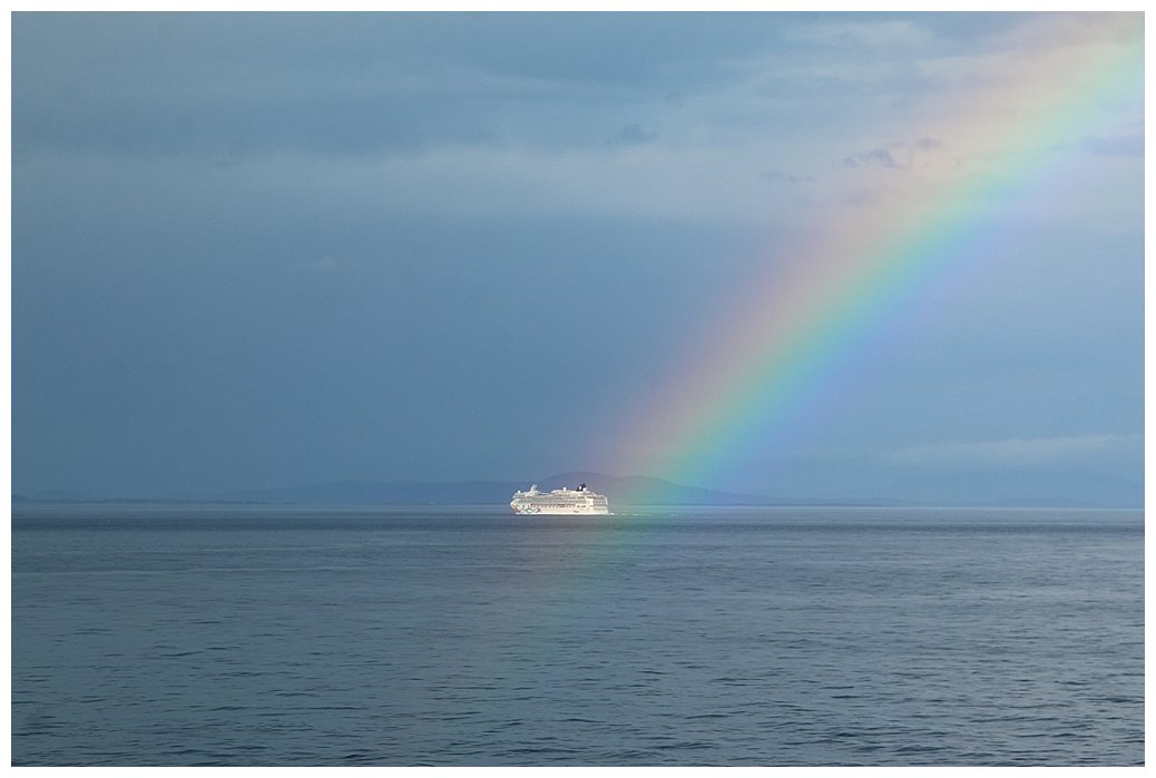 There was eventually some respite as we actually passed Cape Flattery at the western end of the Washington coast, 13 hours after leaving Ketchikan. Not out of the woods though, Victoria having 50 mph winds and Seattle, maximum recorded, 87 mph, trees and power lines down…… All I can do is hope it abates, otherwise Victoria will be a no-go. It has a live web-cam and a great automatic weather transmitter on the breakwater and I access it frequently that day, watching the wind abating slowly. 3 hours later, it’s as if we’re on a different planet, winds have dropped to 20 knots.