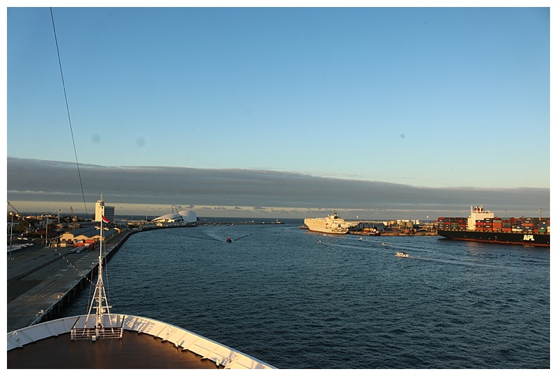 A sharp turn to starboard was involved, to give the pilot-boat a good lee in the strong wind and then an equally sharp turn to port, to get her back on track and ready for the approach to the entrance channel. Because of the wind, we had to keep the speed up and despite the speed, we still ‘crabbed in’, beings set 8° off course and having to compensate. Once through the entrance and behind the buildings of ‘Freo’ as Fremantle is called by the locals, we saw a reduction in wind-speed to a more manageable 15 knots. Another ‘wheelie’ was called for, having to turn through 180° before docking at the Passenger terminal.