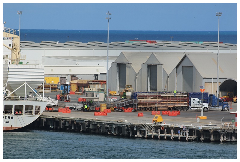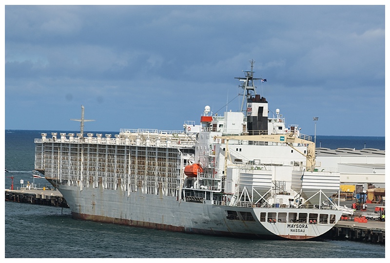 A glorious sunny day beckoned, temperatures in the mid-80sF, around 30C. Container ships were on the berths opposite, as was a Livestock carrier. This unusual vessel transports anything from sheep and cattle, to camels and goats. (Did you know that Australia has more camels than any other country put together)? I certainly didn’t.