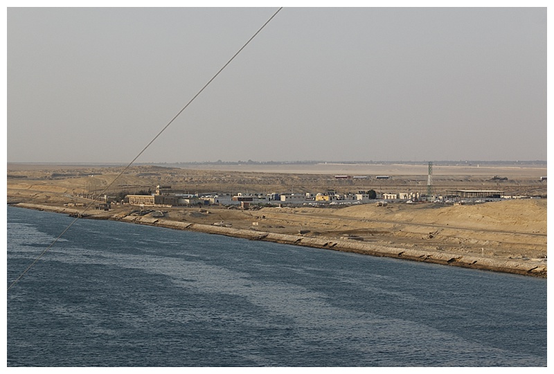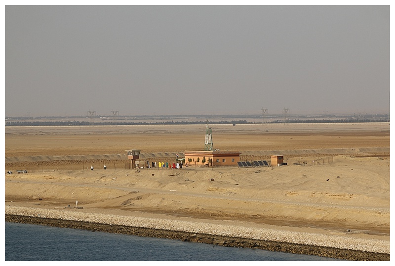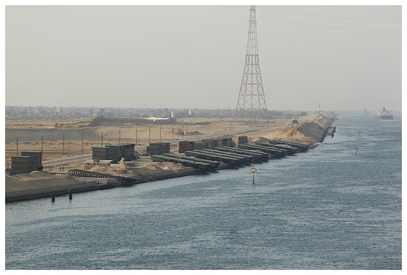 The Sinai peninsular is on our right, Egypt proper is on our left. It could be described as ‘sand on our right’, ‘cultivation on our left’, there is nothing but vast desert to the east. The first item that strikes one is the military presence; watch-towers, walls, pontoon bridge sections, barracks and anti-aircraft weapons.