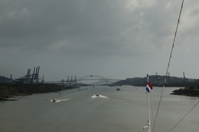 Once out of Pedro Miguel it’s a short ‘hop’ to Miraflores and the last flight that will take us down to sea-level, once through and therefore into the Pacific, we pass Panama port, then under the Bridge of the Americas. While we do so, officials and mooring linesmen disembark, our photographers, who have been recording our progress from ashore, embark. Finally, our pilot leaves us and we are on our own once more, heading towards Ecuador, Manta to be exact, where we arrive on Saturday morning.