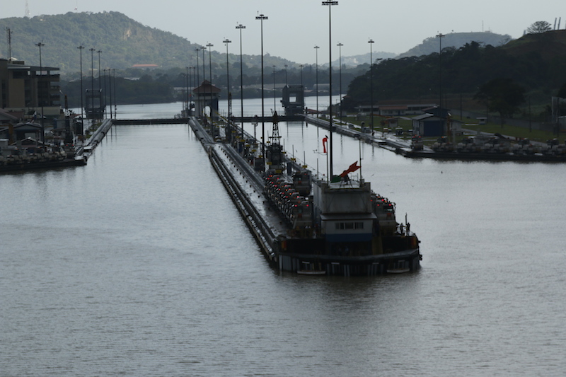 As we approach Gatun, the modus operandi is the same as all the locks we will transit; as near as possible, without touching, (that’s a matter of pride), to the long centre wall, on this the locos wait. Lines are thrown, locos hooked on as the ship moves along and eventually, after the bow is well into the chamber, 3 each side are fast and the locos, advised by the pilot, take us in.