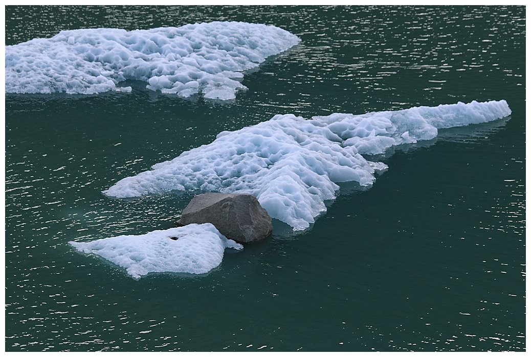 Amazingly, this large rock, carved by the glacier, is still sitting atop the calved iceberg